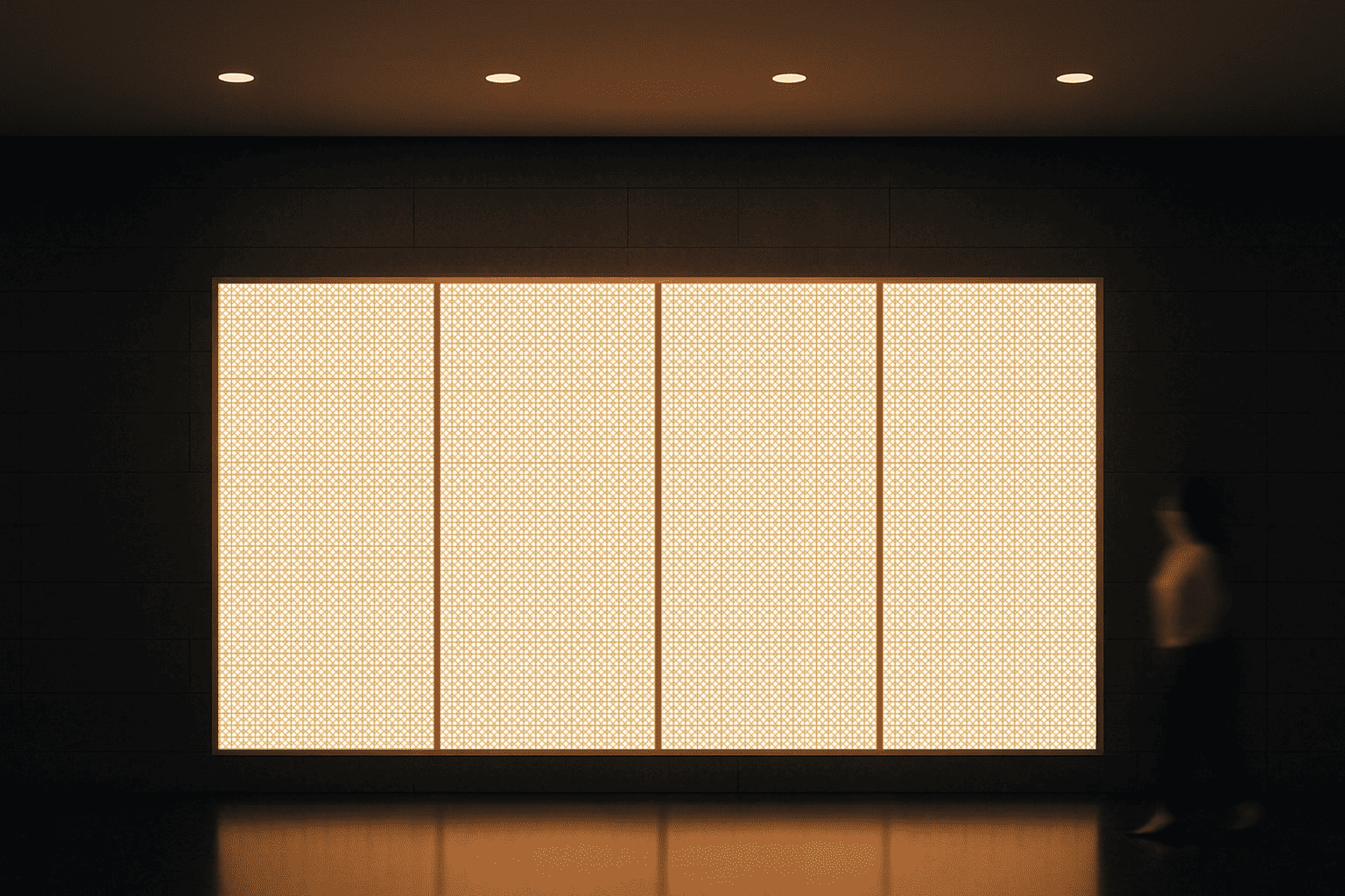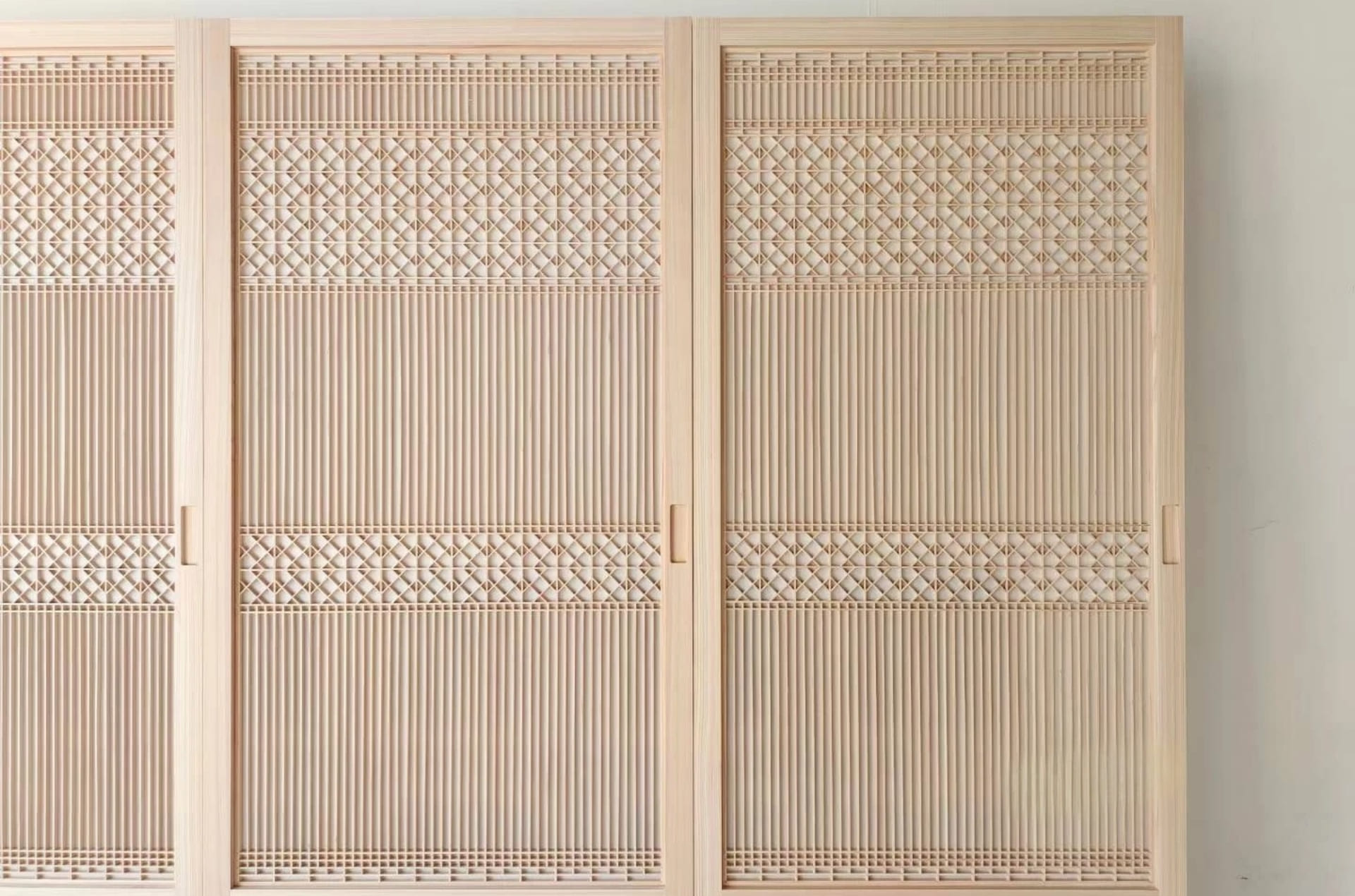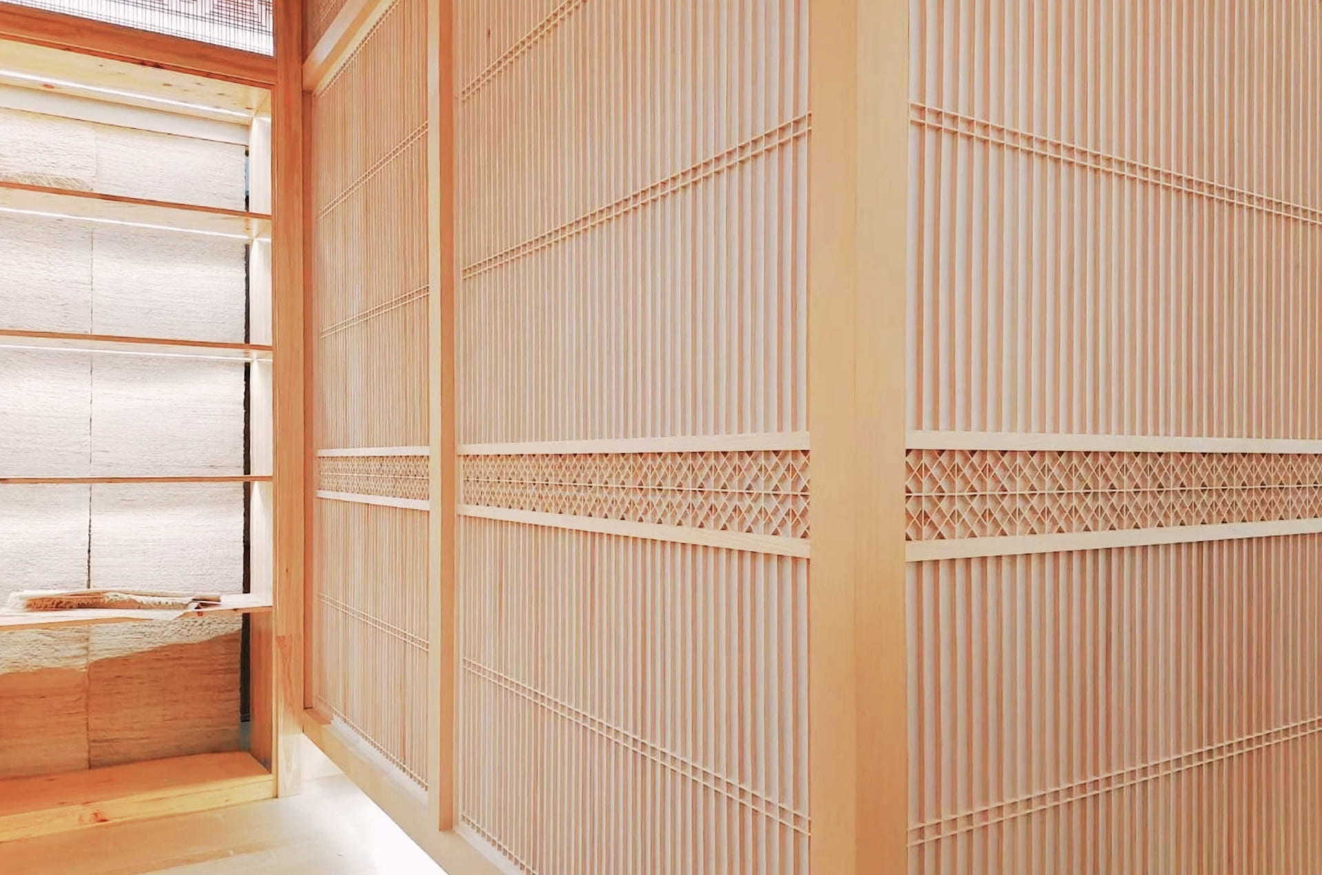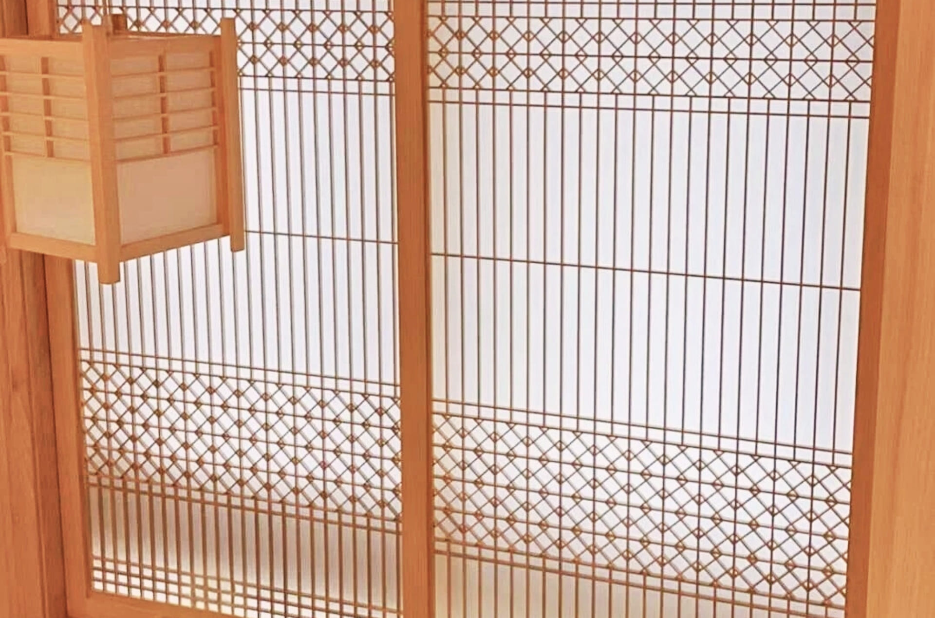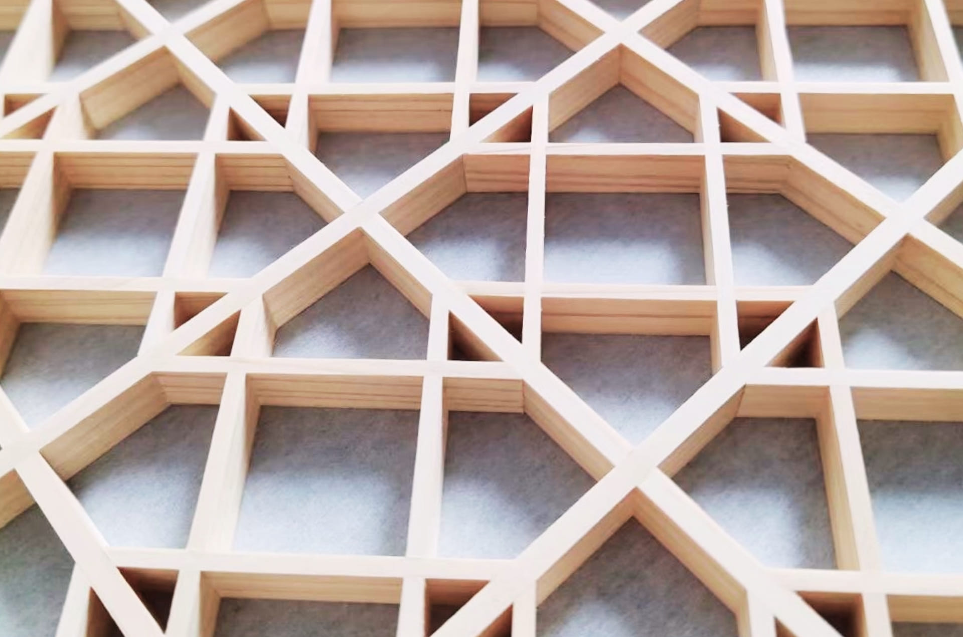 井桁の組子を配した枡組みが連なり、江戸から明治・大正にかけて、半天や法被、浴衣、手ぬぐいなどに親しまれてきた文様です。
