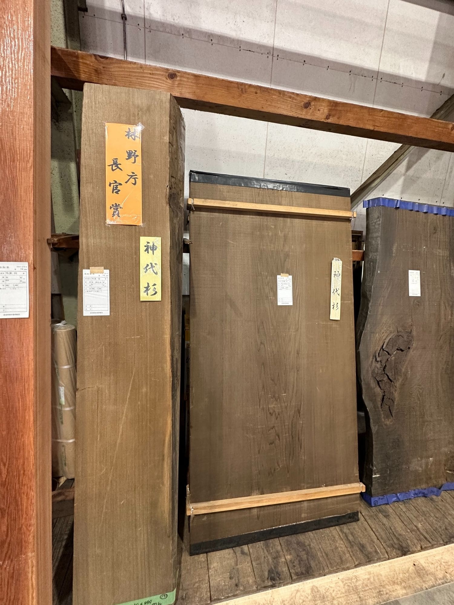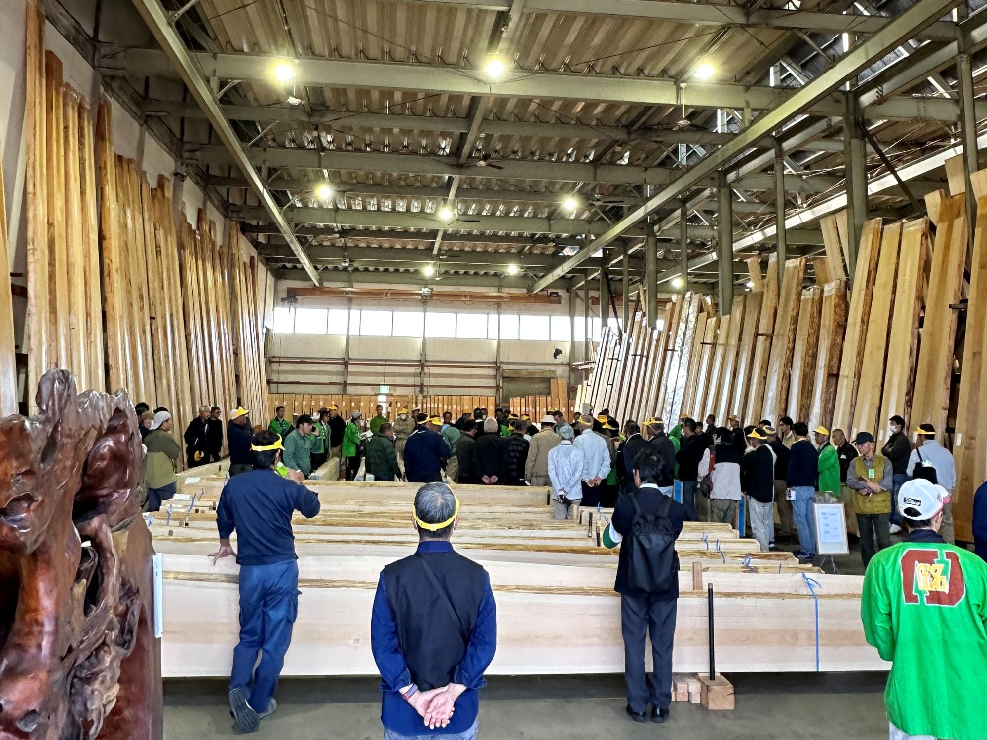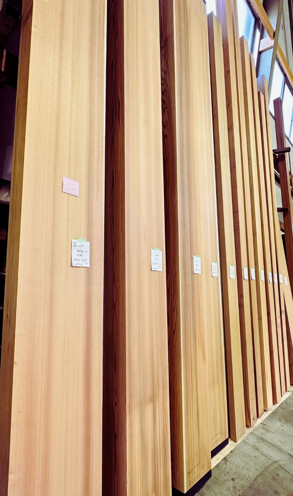 組子の木材|Wood 詩音組子では、主に国産材の「ヒノキ」と「スギ」を使用しています。また、木そのものの色合いや風合いを活かし、作品の完成度を高めるために、 「吉野桧」や「秋田杉」「神代杉」などの国産銘木に加え、ウォルナットやブラックチェリーなどの海外高級材を用いることもあります。 作品に最適な木材を探し求め、私たちは定期的に各地の銘木市場を訪れています。 競りに参加し、年輪や色味、乾燥状態を職人の目で確かめながら、良質な材のみを選び抜きます。 組子細工の主要材料であるヒノキは日本固有の樹種で、法隆寺をはじめ、古くから宮殿や神社仏閣の建築に用いられてきました。 詩音組子では、その中でも「四面無節」という最上級で、長さ3メートル以上の材料のみを使用しています。 手間を惜しまず一本一本を選別するのは、すべて自らの作品に「贅」を尽くすためです。 林業とのつながり 詩音組子のものづくりは、森から始まります。 林業に携わる方々とのつながりを大切にし、木が育った背景にも目を向けています。 森と人、伝統技術と現代空間をつなぐ存在でありたいという想いを、ものづくりの原点としています。 全国木材組合連合会より「合法木材推進マーク」の使用に承認【第 A-00101号】。 詩音組子では、合法性が確認された木材のみを使用しています。 私たちは、今後も「合法木材(Goho Wood)」の普及啓発および推進に取り組んでまいります。