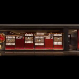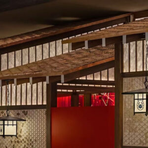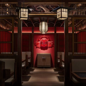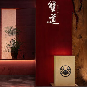 Framed by deep crimson walls and the dignified presence of premium timbers, KANIDŌ presents a dining environment shaped by richness and calm. Softening this dramatic backdrop is the Kumiko artwork “Kogetsu no Shirabe”, integrated into the partitions and seating areas.